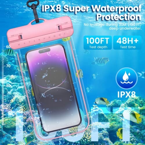 HWeggo 2 Custodia Impermeabile per iPhone 14 Pro Max/13/12/11,Samsung S23Ultra Fino a 8.8",IPX8 Cover Subacquea Con Cordino,Design Fluorescente,Antipolvere e Antivegetativa(Trasparente+Rosa)
