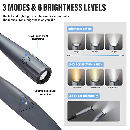 [Luce di lettura ideale per libri a letto] Questa lampada da lettura ha 3 modalità di temperatura colore utili per il tuo umore di lettura notturna: giallo (2700 K), bianco caldo (4500 K) e bianco freddo (6500 K). Il controller del colore si trova sulla parte posteriore del collo. toccare per regolare la modalità colore, ogni testa possiede un interruttore a induzione indipendente, toccare per regolare la luminosità.