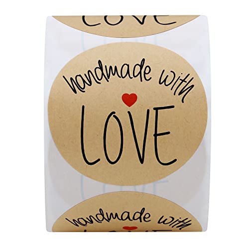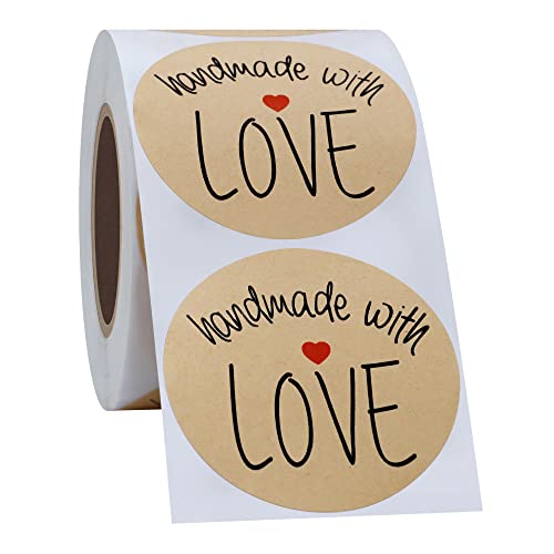 Hybsk Adesivi rotondi fatti a mano con amore, 5,1 cm, in carta kraft naturale, fatti a mano, 300 etichette adesive per rotolo (5,1 cm)