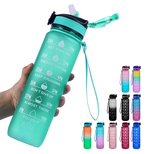 HYCOPROT Borraccia in Tritan da 1 Litro Con Cannuccia e Indicatore del Tempo Prova, Bottiglia Motivazionale Senza BPA, Borracce Sportiva Prova di Perdite per Palestra Sportiva e Fitness(1000ml,verde)