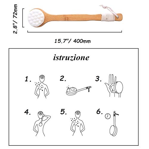 DESIGN MANICO LUNGO - Una resistente impugnatura in bambù naturale è lunga oltre 15,7 "(400 mm). È abbastanza lungo per pulire qualsiasi area del corpo. L'impugnatura è avvolta con una corda di cotone per aumentare le prestazioni dell'impugnatura. La corda sospesa all'estremità della maniglia per un comodo spazio per appendere.