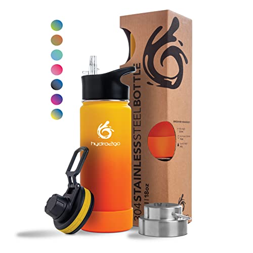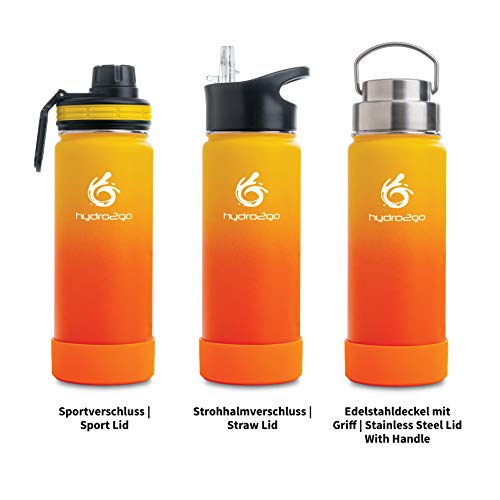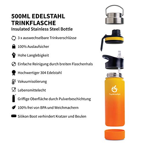 Hydro2go ® Borraccia in acciaio inossidabile da 500 ml / 0,5 litri - per bambini, scuola, sport, fitness e attività all'aperto | Bottiglia termica in acciaio inossidabile senza BPA + 3 tappi per bere