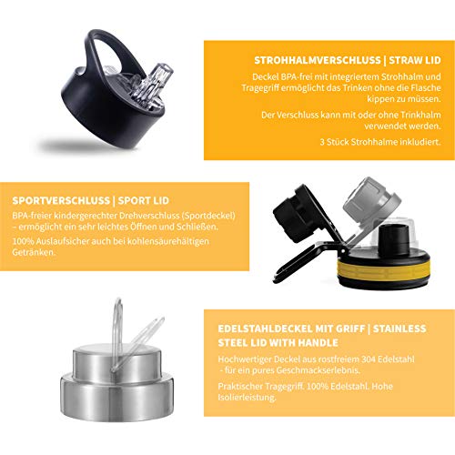 3 coperchi pratici: i coperchi in dotazione sono compatibili con tutte le borracce idro2go: 1. Chiusura sportiva dinamica. 2. Coperchio in acciaio inox con manico per il trasporto. Tappo di paglia (cannucce di ricambio incluse).