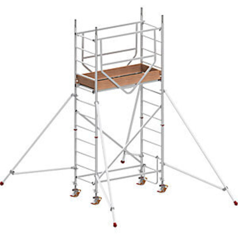 Trabattello mobile ADVANCED SAFE-T 7070, saldato, piattaforma 1,58 x 0,61 m, modulo 1+kit+set di stabilizzatori. Fornitura = smontato. Larghezza piattaforma = 610 mm. Altezza piattaforma = 2250 mm. Lunghezza piattaforma = 1580 mm. Altezza di lavoro = 4.25 m. Altezza di salita = 2250 mm. Altezza trabattello = 3.47 m. Peso = 81.6 kg. Materiale = alluminio. Portata = 200 kg/m². Dotazione ruote = rotella pivottante con vite filettata. Diametro ruote = 150 mm. Larghezza trabattello = 0.72 m. Norma = DIN EN 1004-1. Tipo di prodotto = trabattelli mobili standard. Flessibile - ampliabile con altri moduli. Compatto - ingombro ridotto durante trasporto e magazzinaggio. Pratici - montati o smontati in solo 12 secondi. Impiego su superfici irregolari grazie alle rotelle regolabili in altezza. Questo trabattello mobile si distingue per il suo innovativo concetto di montaggio. Prima dell'uso, le piattaforme possono essere equipaggiate con parapetti montabili da terra, garantendo un appoggio sicuro