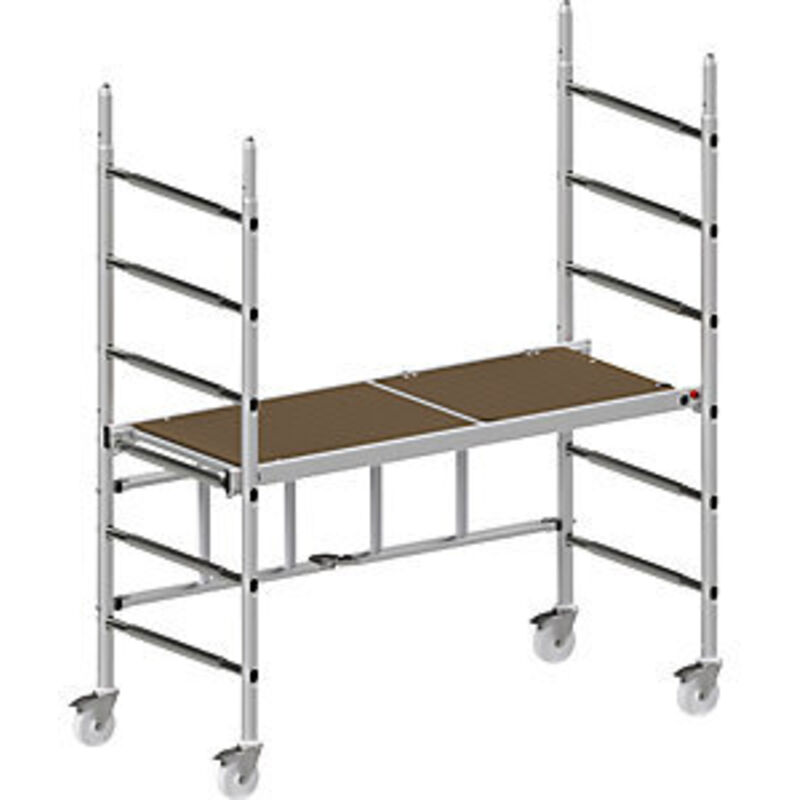 Impalcatura modulare ALUPRO CONCEPT, modulo 1, altezza da terra 0,89 m, lunghezza piattaforma 1,58 m. Fornitura = smontato. Lunghezza piattaforma = 1580 mm. Altezza di lavoro = 2.39 m. Altezza di salita = 0.89 m. Altezza trabattello = 1.83 m. Peso = 23.2 kg. Materiale = metallo. Portata = 200 kg/m². Dotazione ruote = 4 rotelle pivottanti con fermo. Diametro ruote = 125 mm. Norma = norma DIN EN 1004. Tipo di prodotto = trabattelli modulari. Il modulo base è un'impalcatura pieghevole che passa sotto qualsiasi porta. Quattro ruote pivottanti frenanti incluse. Impalcatura mobile leggera e flessibile con dimensioni compatte per il trasporto e il magazzinaggio. Montaggio e smontaggio veloci grazie alle chiusure a scatto sui montanti e sulle diagonali. Spaziosa piattaforma lunga 1,58 m. Grande superficie di lavoro con elementi larghi 0,72 m. Attrezzi necessari solo per il montaggio iniziale di stabilizzatori e del tubo di supporto.