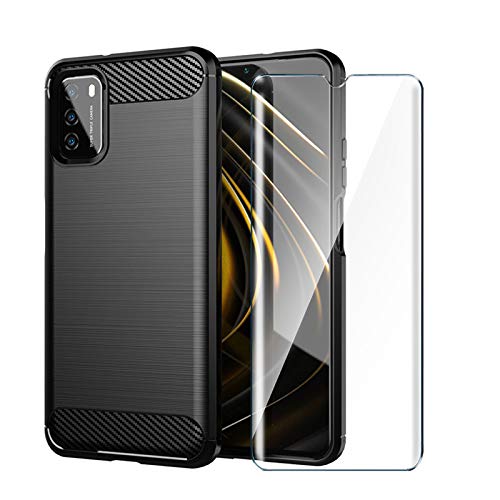 HYMY Cover per Xiaomi Poco M3 Nero Custodia + 1 x Pellicola Protettiva - Morbida Silicone Fibra di Carbonio Assorbimento degli Urti Case Protettivo Copertura