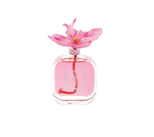 Diffusore di profumo di Hypno Casa. Proposto in un'elegantissima e bellissima ampolla quadrata da 100ml, con un dettagliato fiore a forma di orchidea che si colora assorbendo il profumo, propagandolo così in tutta la stanza.