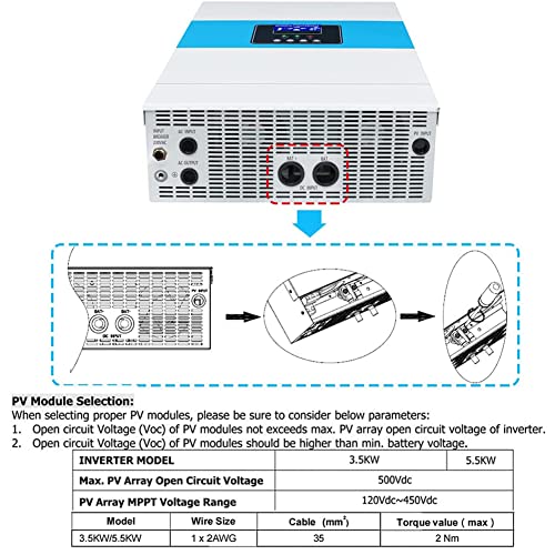 CARICABATTERIE INVERTER SOLARE: inverter solare da 5500 W da 48 V CC a 220 V CA integrato nel controller solare da 100 A mppt. È un nuovo inverter solare ibrido all-in-one, potenza massima PV: 6000 W;
