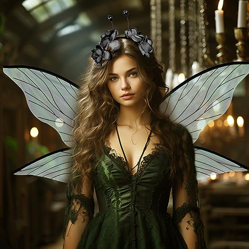 Hysagtek 5 pezzi nero fata ala cosplay accessori per ragazze e donne scintillanti ali di farfalla con orecchino/corona di fiori/stella bacchetta per Halloween mascherata compleanno festa carnevale