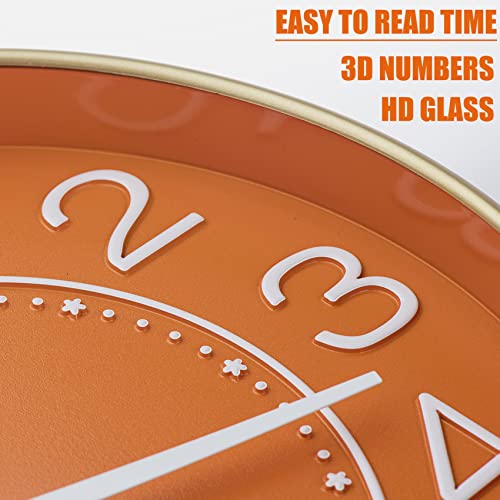 HZDHCLH Piccolo orologio da parete a batteria, movimento al quarzo, silenzioso, moderno, senza ticchettio, per soggiorno, camera da letto, cucina, ufficio, scuola, aula (25,4 cm, arancione e oro)