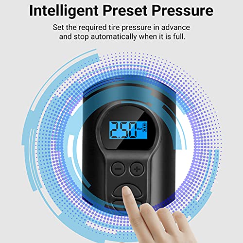 MINI GONFIATORE INTELLIGENTE E AUTOMATICO: Questa pompa ad aria elettrica supporta 4 unità opzionali: PSI, BAR, kPa, Kg/cm². Puoi controllare rapidamente la pressione attuale dei pneumatici e preimpostare la pressione dei pneumatici di cui hai bisogno, si spegnerà automaticamente una volta raggiunto il valore preimpostato.