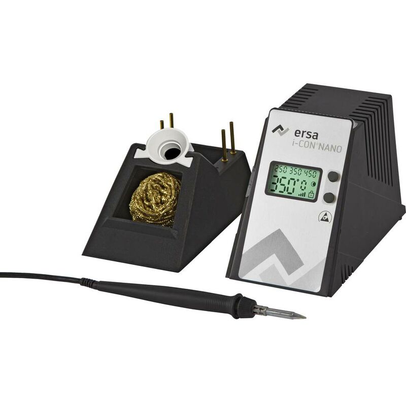 Dettagli tecnici Dimensione del prodotto, larghezza 80 mm Dimensione del prodotto, lunghezza 145 mm Dimensioni (L x L x A) 145 x 80 x 103 mm Dimensioni prodotto Altezza 103 mm Indicatore (digitale/meccanico/analogico) digitale Potenza (max.) 80 W Temperatura (max.) +450 °C Tensione di funzionamento 230 V Tipo prodotto Stazione di saldatura Potenza del saldatore i-Tool: 80 W Stazione di saldatura ERSA i-CON Nano Piccolo e potente! - La stazione di saldatura ERSA i-CON nano con saldatore nano i-Tool ha un ingombro di soli 145 mm x 80 mm. L'i-CON nano, soddisfa tutti i requisiti della produzione industriale odierna con un ingombro minimo (solo 145 x 80 mm). È progettato per l'uso continuo nella produzione di elettronica e per applicazioni speciali in laboratori e sviluppo. È antistatico secondo MIL-SPEC/ESA. Il semplice concetto di funzionamento dell'i-CON nano permette all'utente di impostare la temperatura di esercizio in modo variabile e di definire il tempo di standby e un valore di