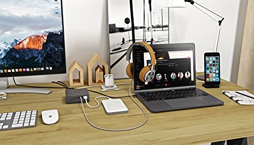 1 Audio Jack 3.5 mm per collegare cuffie e microfono, Interruttore ON/OFF per spegnere e accendere la stazione dock, 1 ingresso per adattatore di alimentazione esterno (uscita: DC 20 V / 5 A, mass. 100 W). Si richiede la porta USB-C che supporta “DisplayPort Alternate Mode” e “Power Delivery” (non tutti i dispositivi o sistemi dotati di interfaccia USB-C soddisfano questo standard) o la porta Thunderbolt 3;