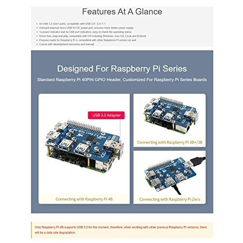 IBest USB 3.2 Gen1 HUB Hat Purpose-Made for Raspberry Pi 4,Compatible with Raspberry Pi 3 B+ 3 B 2B Zero/Zero W/2 W/Zero WH/2 WH,4X USB 3.2 Gen1 Ports,Compatible with USB 3.0/2.0/1.1,Driver-Free