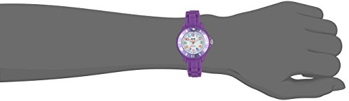 È un orologio in silicone viola. Con il piccolo quadrante di colore bianco e i grandi numeri multicolori, imparare a leggere l'ora è semplicissimo. Un orologio perfetto che piacerà moltissimo ai bambini