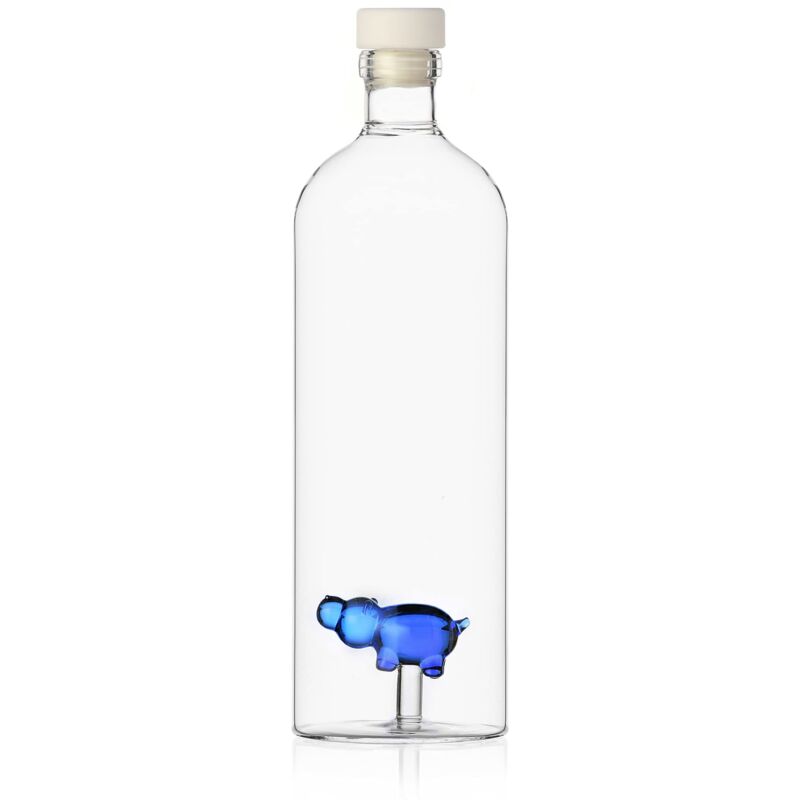 Bottiglia con ippopotamo in vetro borosilicato della linea Animal Farm, fatta a mano e modellata a lume, disegnata da Alessandra Baldereschi. La collezione popolata dagli animali dell'immaginazione della Baldereschi ci permette di tornare con leggerezza alla nostra infanzia e di ritrovare il legame più profondo con la Natura. Versiamo dell'acqua e ci sentiamo vicini alla natura, un mondo amico, stravagante. Grazie al tappo ermetico è possibile conservare i liquidi.