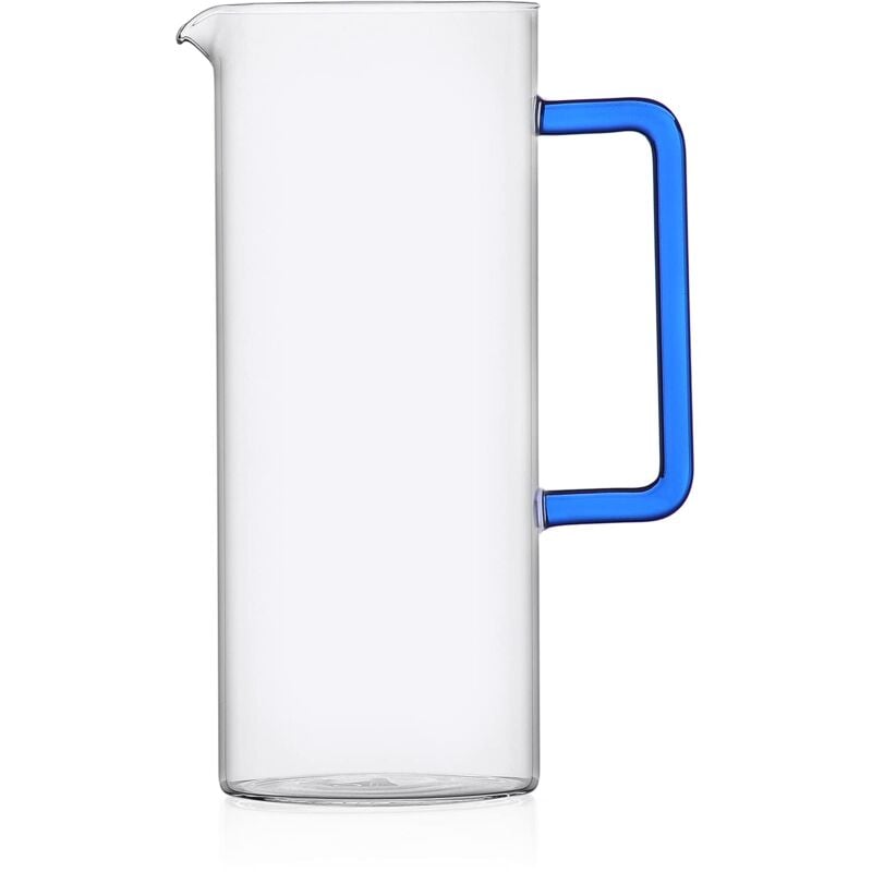 Brocca clear con manico blu in vetro borosilicato della collezione Tube colore, fatta a mano e modellata a lume.