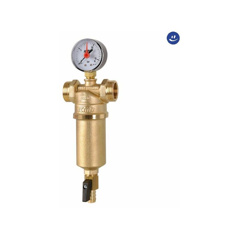 Filtro autopulente per acqua con cartuccia filtrante in acciaio inox estraibile,manometro e rubinetto di scarico con attacco portagomma Grado di filtrazione 100 micron Pressione max di esercizio 25 bar Attacco esterno femmina 1"1/2