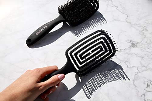 SETOLE DI CINGHIALE E SETOLE DI NYLON: oltre alle lunghe setole di nylon premium con rivestimento antistatico, le spazzole sono anche dotate di setole di cinghiale che facilitano una spazzolatura delicata ed efficace dei capelli.
