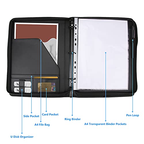 【DESIGN MULTIFUNZIONALE】 - La cartella per conferenze in pelle è un buon aiuto per l'ufficio, include 2 portadischi U, slot per schede multiuso, piccola tasca laterale, cartella per file A4, portapenne e 8 tasche per documenti trasparenti. 3 raccoglitori ad anelli e chiusura lampo di sicurezza, non solo flessibile da usare, ma evita anche la perdita di file e mantiene i tuoi dati al sicuro quando sei in viaggio o in luoghi affollati.