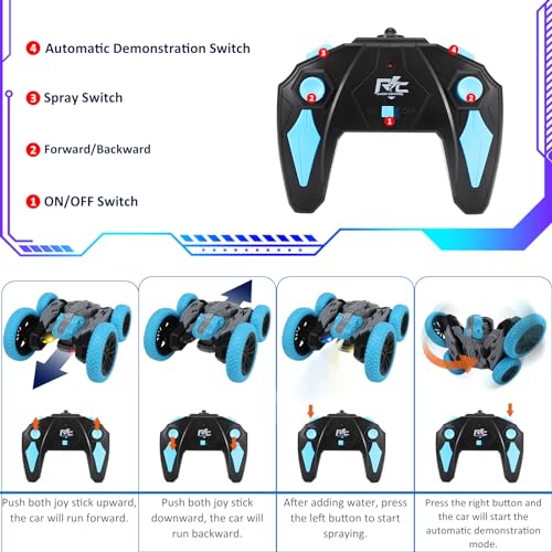 Icyant Remote Control Auto con spray, 2,4 GHz Dinosaur RC Autote giocattoli a 360 ° rotante 4WD OFF RACING RC Auto RC con musica e fari a LED per camion Giochi per ragazzi Girls Girl Età 3+ (Blu)