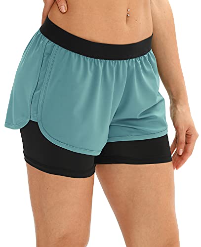 Icyzone Pantaloncini Donna Sportivi,2 in 1 Shorts Donna Sportivi Elastici e ad Asciugatura Rapida per Corsa,Fitness,Yoga (S,Azzurro)