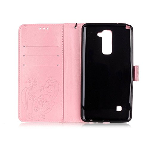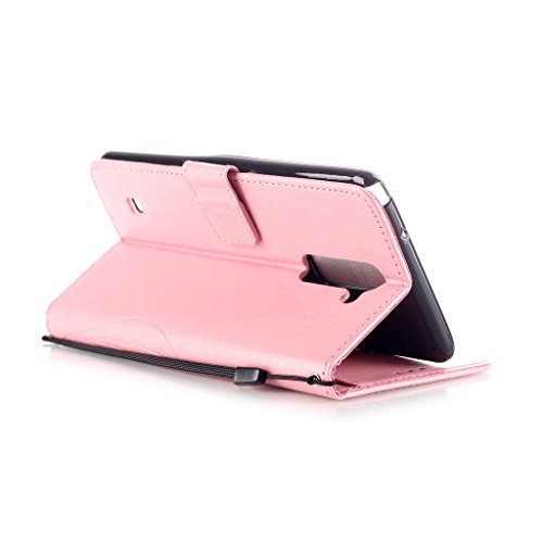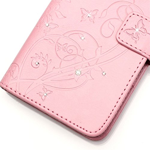 Idatog - Custodia a libro per HTC 626, con protezione per lo schermo in vetro temperato, chiusura magnetica, alta qualità, stile classico ed elegante, in pelle PU con incisioni di farfalle e strass, con funzione di supporto e slot per carta di credito, perfetta per il vostro smartphone, Ecopelle, Pink, LG Stylus 2 LS775/G Stylo 2 K520