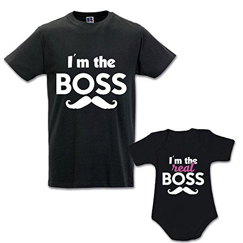 Idea Regalo Coppia di T-Shirt Papa' Figlio Boss - Real Boss Nere Femminuccia Uomo XL - Bimbo 9 Mesi