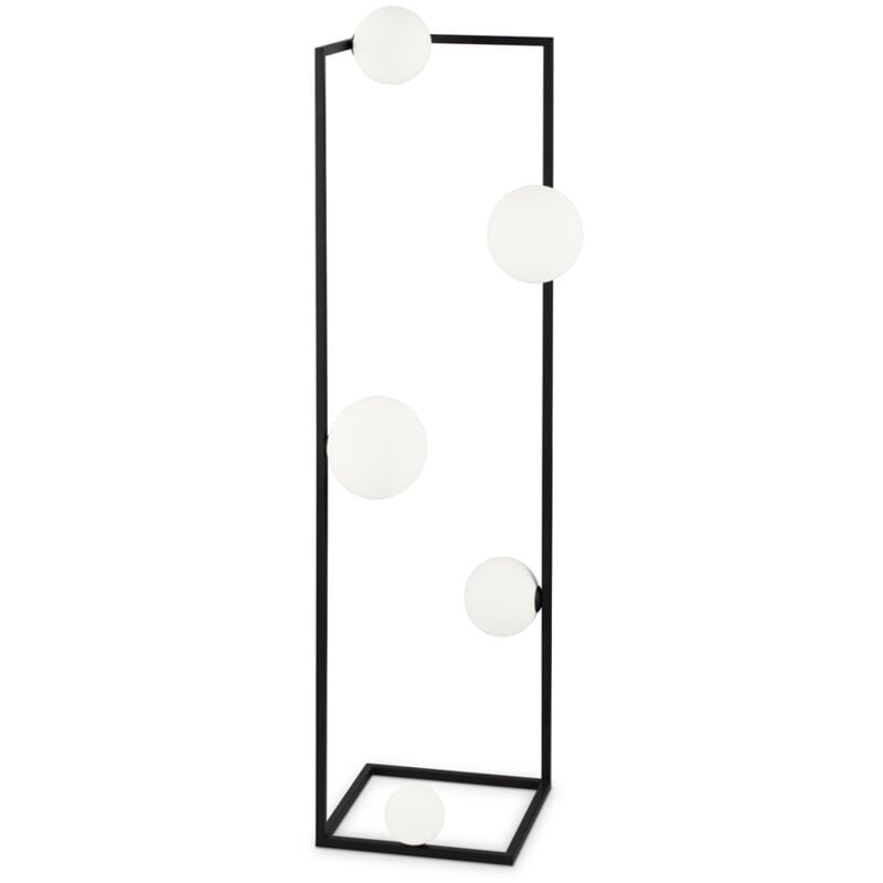 Collezione Angolo STILE SENZA CONFINI Piantana 5 luci contemporanea con montatura in metallo verniciato nero.. Elementi diffusori in vetro bianco soffiato e acidato con cavo in PVC nero con interruttore e spina.