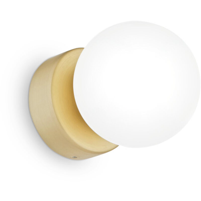 Applique con montatura in metallo con struttura lineare a sezione tonda ottone satinato con diffusore in vetro pirex bianco acidato.