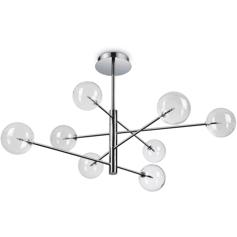 Montatura a braccio in metallo con finitura cromo o ottone antico. Diffusori in vetro soffiato trasparente. Ø 1280 x H 720 mm G4 max 8 x 2W IP:20