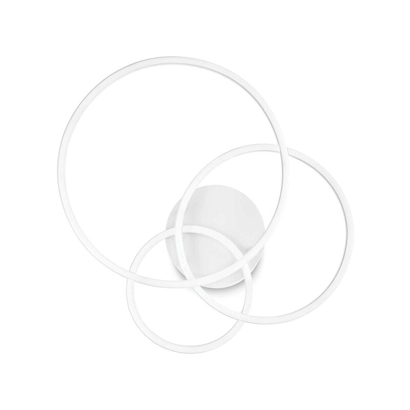 Collezione Frame INCROCI LUMINOSI Plafoniera che riproduce 3 cerchi che si incrociano con base e montatura in metallo verniciato bianco opaco.. Diffusori in materiale plastico colore opale. Emissione luce diretta Led 40 W 3000K (tonalità calda).