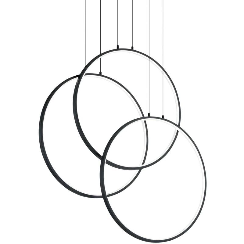 Base e montatura in metallo verniciato bianco opaco o nero opaco. Diffusori in materiale plastico colore opale. Cavi regolabili in lunghezza. Emissione luce diretta. L 68,5 x H min 80 / max 120 x P 13 cm LED 82W 30000 h 3000 K 7300 lumen IP:20
