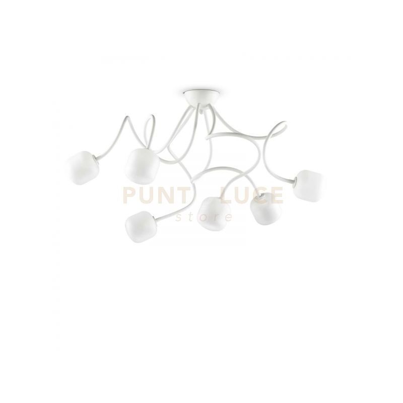 Lampadario a soffitto con base in metallo rifinito opaco e bracci flessibili rivestiti da gomma di colore bianco con diffusori in vetro trasparente soffiato e sabbiato.