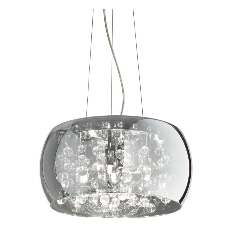 Collezione Audi-80 VETRO E CRISTALLO Sospensione a 5 luci con montatura in metallo cromato. Diffusore in lastra di vetro fume' con spessore di 10 mm. Emette luce verso l'alto e verso il basso.