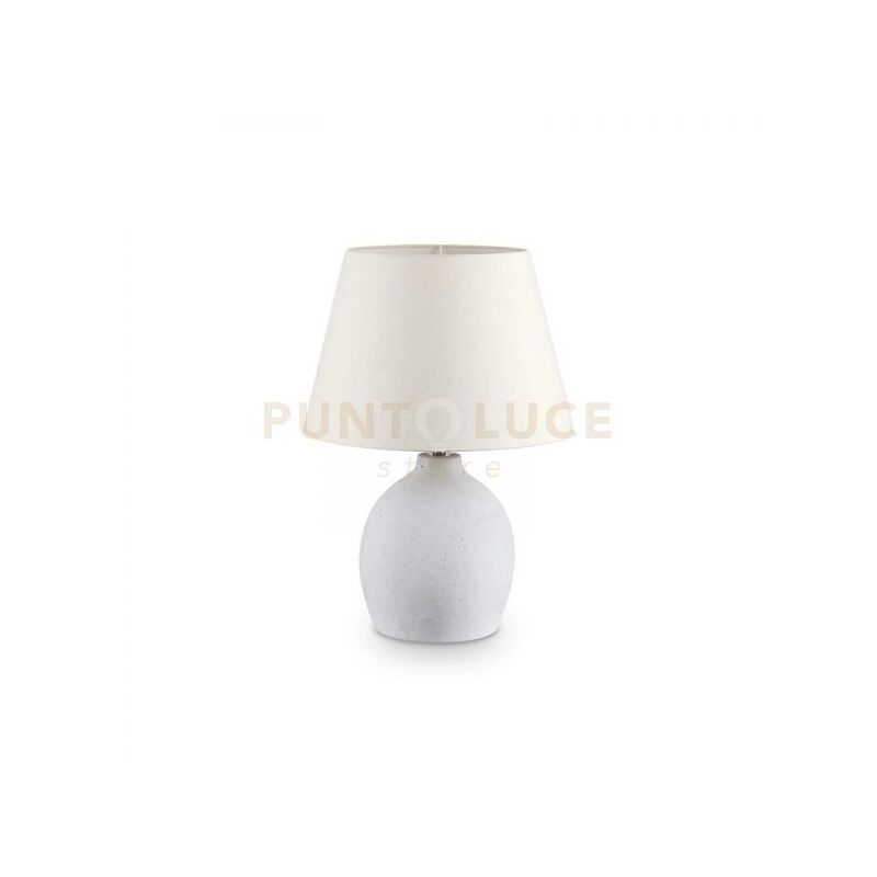 Base in cemento lavorato artigianalmente. Paralume in pvc rivestito con tessuto. Cavo in tessuto con interruttore.
