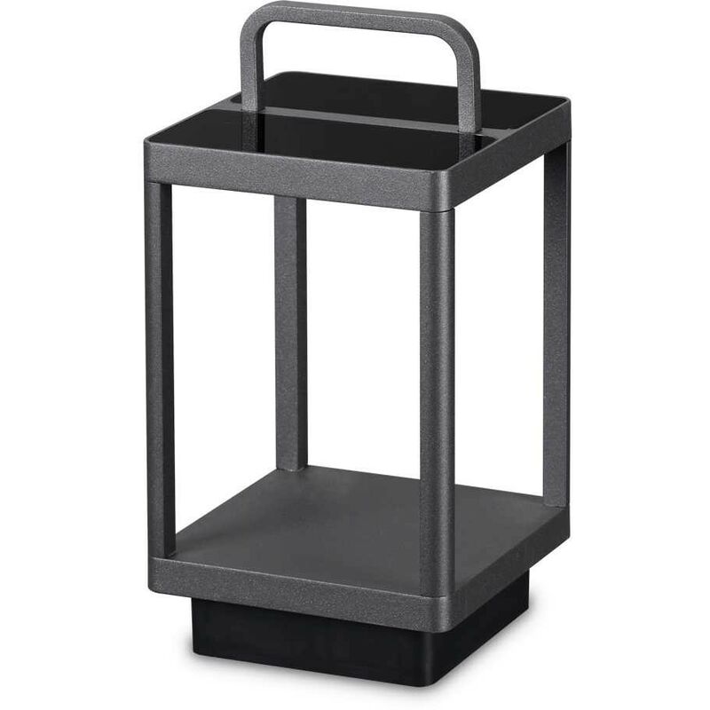 Lanterna portatile a batteria. Montatura in alluminio pressofuso verniciato a polveri con finitura antracite con elementi in vetro nero sulla parte superiore. Diffusore in vetro temperato trasparente. Emissione luce verso il basso. L 180 x H 350 x P 180 mm LED 3W 20000 h 3000 K 330 lumen IP:54