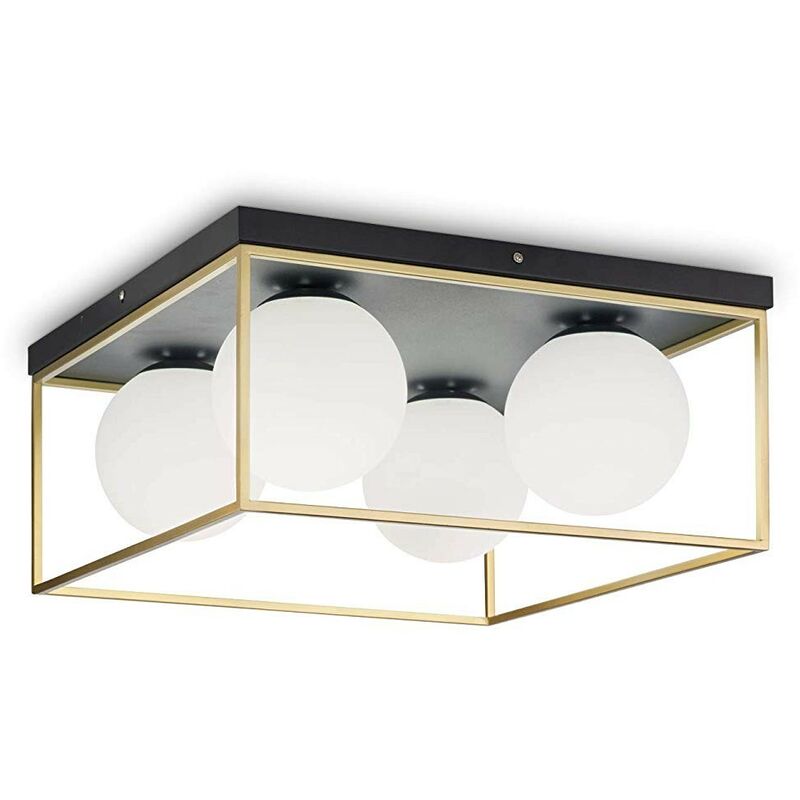 Lampada a soffitto dallo stile decò con montatura in metallo verniciato nero opaco o base nera opaca e telaio ottone opaco con 4 diffusori in vetro incamiciato bianco, soffiato e acidato. L 45,5 x H 21,5 x P 45,5 cm E14 max 4 x 40W IP:20