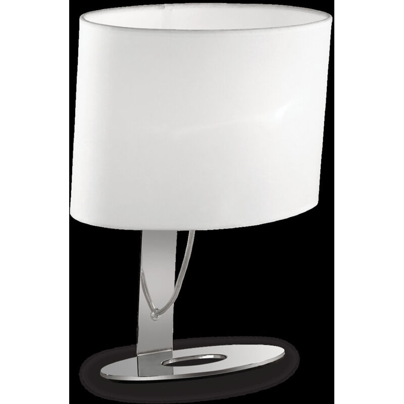 Lampada da tavolo con montatura e base in metallo cromato - con paralume in lamina di pvc rivestita in tessuto;