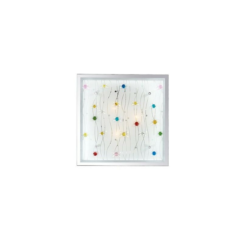 Diffusore composto da due lastre di vetro: sotto con bordo a specchio e smerigliato al centro, sopra con decorazione serigrafata e applicazioni di bottoni in vetro. Ferma vetro in cromo. L 420 x H 420 x P 90 mm max 3 x 60W E27 IP:20