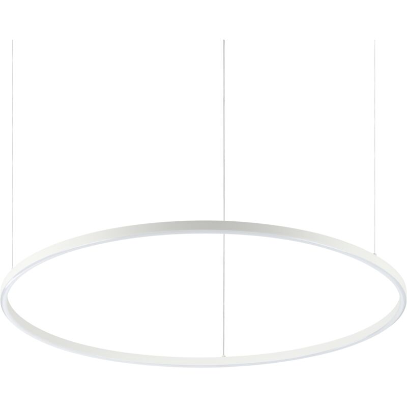 Lampada a sospensione costituita da una montatura sottile in alluminio verniciato bianco o nero opaco e diffusore opale in policarbonato. Cavo elettrico in pvc trasparente. Ø 900 x H min 275 / max 2025 mm 55W 20000 h 3000 K 5400 lumen IP20