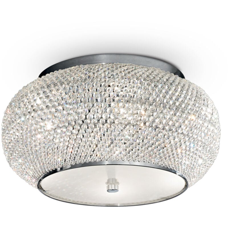 Montatura in metallo. Diffusore composto da filari di perle in cristallo molato e fondo chiuso da vetro circolare sabbiato. Ø 400 x H 220 mm max 6 x 40W E14 IP:20