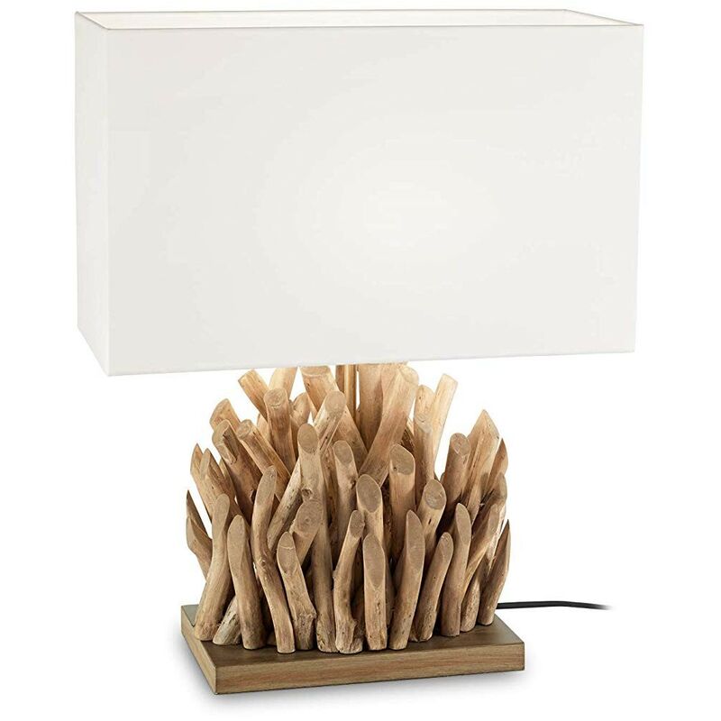 Base in legno naturale. Corpo luce formato da rami veri. Paralume in lamina di pvc rivestita di tessuto. L 40 x H 50 x P 18 cm E27 max 1 x 60W IP:20