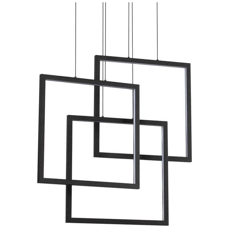 Collezione FRAME INCROCI LUMINOSI Sospensione che riproduce 3 quadrati che si incrociano con base e montatura in metallo verniciato bianco opaco. Diffusori in materiale plastico colore opale. Cavi regolabili in lunghezza. Emissione luce diretta tonalità calda 3000 K Led 80 W.