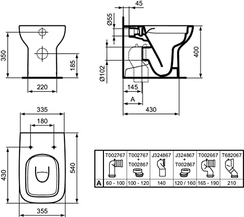 Vaso universale con scarico traslato, in abbinamento alle relative curve tecniche, può coprire distanze dal muro tra i 60 e 210mm