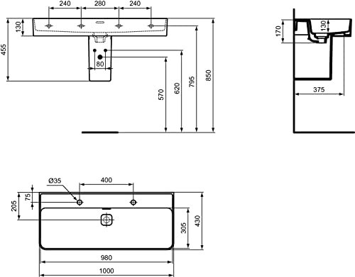 Ideal Standard - Strada II, Lavabo rettangolare da 100cm, Con foro per la rubinetteria, Con troppopieno, Bianco