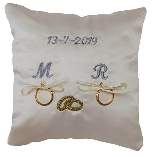 Ideeanto Cuscino portafedi Nuziali Personalizzato con Le iniziali degli sposi e Data in Raso Avorio