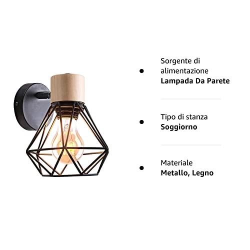 IDEGU Lampada da Parete Vintage 16CM Applique da Parete in Legno Metallo Design Gabbia Industriale E27 Illuminazione Interni Lampada a Muro per Corridoio Soggiorno Camera da Letto (Tipo-B Nero)