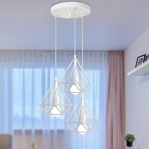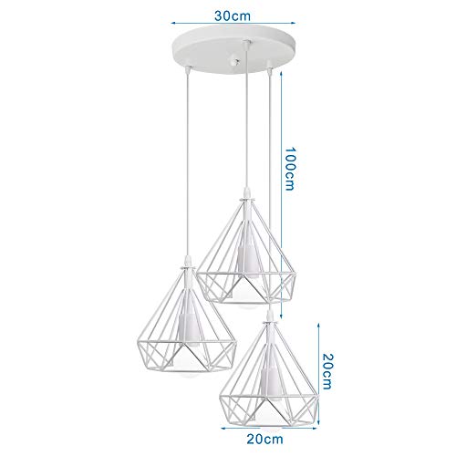 IDEGU - Lampadario a sospensione vintage a forma di diamante, in metallo, lampada industriale, gabbia di illuminazione E27, per sala da pranzo, camera, caffè, bar (bianco)