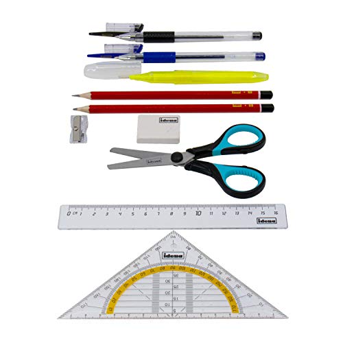 Idena- Set Scolastico con matite, Righello, Penne Gel, Squadra, Forbici e Altri Accessori, 10 Pezzi, Ideale per Scuola e università, Multicolore, 20094